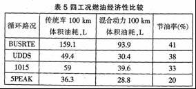 通过仿真分析,混合动力城市客车的燃油经济性和节油效率见表5。