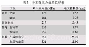 按照所给工况、载荷及约束条件,分别建立模型进行计算,得出车身骨架最大应力及最大位移,结果如表1所示。