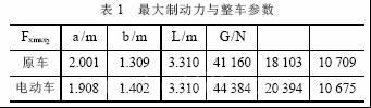 由式(1)、式(2)计算得原车和改装后混合动力车所需的最大制动力及整车参数值如表1所示。