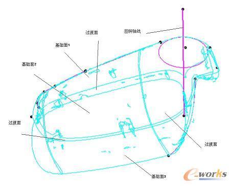 在建模之前要先对拟合成三角面的点云数据进行网格划分,目的是要重建曲面之前,在所划分的网格上绘制3D曲线,再使用这些曲面拟合曲面。利用DSE模块的平面曲线功能(Curve On Plane)和交线曲线功能(Curve from Scan)命令,在所设定的方向上绘制曲线。在曲面划分过程中,注意一些特征线与特征点,主特征线表达了原产品的设计意图,在某种程度上比曲面光顺更为重要。该后视镜的曲面的大至划分及特征钱如图4。