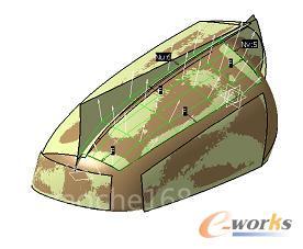 对于有装配关系的产品逆向而言,装配关系应该是最重要的考虑因素。对于该产品来说,后视镜与盖板之间的配合面只于达到G1连续即可,所以主要使用GSD(创成式曲面设计)模块中的命令来完成。在曲面的设计过程中,注意两零件之间的配合间隙。最终完成后的曲面如图10。