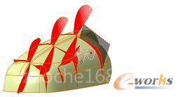 该产品有后视镜和盖板两部分构成,且它们有共同的回转轴线,以便实现在车体上的转动。分析三角面数据,找出与盖板配合处的交线,及回转轴线,作为建模的基准。对于塑料件来说,确定产品的分模线很重要,我们使用QSR模块的斜率分割命令(Segmentation By Slope Criterion 找出分模线位置。如图3