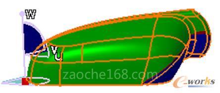对于基础曲面,主要使用自由曲面模块(Free Style)模块对曲面进行构建,FSS模块有创建曲线及曲面的功能,而且可以对所创建的曲线和曲面通过控制点及控制网格的调节,对曲面或曲线进行修正,并有强大的外形分析能力,可以保证所绘制的曲面质量。在该后视镜的逆向过程中主要使用曲控制点(Control Point)命令,对曲面进行调节,以使用曲线或曲面逼近点云,当然有时候也要借助所绘制的曲线,使用网格曲面(Net Surface)命令,进行铺面。在拟合过程中尽可能的采用尽可能少的面片,面片采用贝齐尔(BEZIER)曲面,曲面使用单段面,为保证曲线或曲面的光顺度及易于调节,线或面的阶线一般不超过6节。在曲面的调节过程中注意使用距离分析(Distance Analysis)命令,检查点云与曲面的距离,以满足逆向要求,并使用高率曲率分析(Surface Curvature Analysis)命令对曲面进行分析,以保证面的质量。逆向设计其实就是在曲面光顺度与点云之间精确度取一个最佳值,在保证曲面光顺的前提下,尽可能的与点云贴合。
