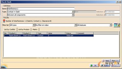 因该产品是有两个零件所组成,所以对其进行一下尺寸检测,以防之有不必要的干涉还是有必要的。首先对两个部件分成两个单独的零件调入到装配环境中,使用DMU模给中的空间分析模块(SPA)中的碰撞检查(Clash)(图13)及剖截面命令(Sectioning)(图14)对产品进行干涉检测。