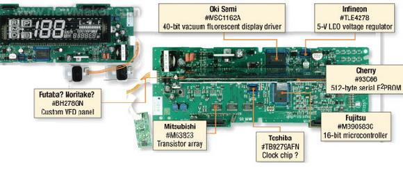 虽然VFD所需的电流不是特别高,但它却要求高电压;另外,一款Oki Semiconductor的MSC1162A 40位VFD显示驱动器将来自富士通MB90583C 16位微控制器的输出转换为合适的电平,以从该面板密封的真空腔内的驱动电极中得到荧光。