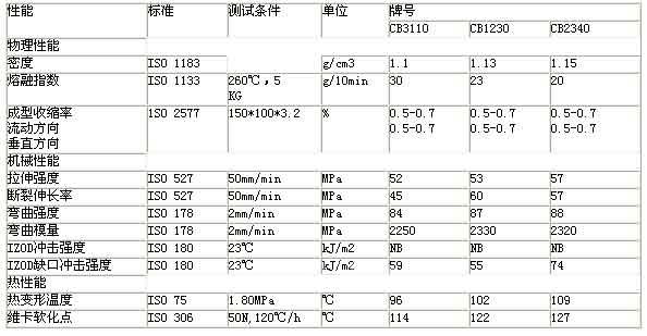 对于一些需要经受较高温度的部件,ABS的耐热性还需要提高。提高ABS耐热性的一种常用方法是将ABS与PC共混做成ABS/PC合金。表2是某公司生产的汽车用耐热ABS/PC合金材料。