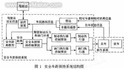 基于CAN总线的安全车距保持系统通过对车辆的油门开度和制动压力进行控制,在危险工况下,迫使车辆减速,从而减轻碰撞强度甚至避免碰撞;在安全工况下,使自车与前车保持安全距离行驶,能取代驾驶员进行部分操作,降低驾驶员的劳动强度,提高行车安全性。利用CAN总线优越的容错性和可靠性,满足安全车距保持系统的分布式协同控制和实时性的要求。