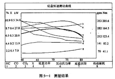 在恒速状态下配合尾气分析仪,我们进行了发动机输出功率、轮输出扭矩及功率 、传动损耗功率、CO、CO2、HC、O2等8个参数的测量,并对速度、功率、扭矩进行了实时监控,测量结果如图5—1所示。