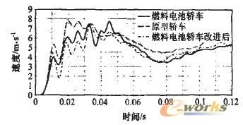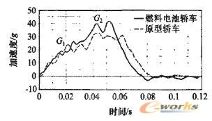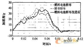 同时,将原前纵梁前段添加一组引导棱角,中段添加一加强板。同时将支架原先采用的强度过高的材料弱化。由计算结果可知,改进后的燃料电池轿车正面碰撞加速度波形是向理想波形的趋势变化,整体碰撞时间明显延长,加速度峰值也有所下降,已接近原型轿车的等级,如图16所示。