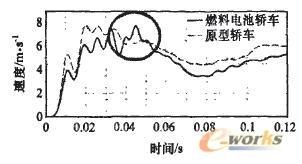 车门对应人体胸、腹及骨盆区域的侵入速度和对人体的伤害程度有很大的关系。经过计算,考察两车车门内饰件对应乘员肋骨、腹部以及骨盆区域的侵入速度以及侵入量可知:在乘员空间侵入量方面,燃料电池轿车相比原型轿车要稍小一些;在侵入速度方面,对于胸部及腹部区域,两车的情况基本保持一个水平。但是对于骨盆区域在侵入速度曲线的“第二峰”阶段,燃料电池轿车侵入速度明显上升,如图10所示,这对乘员骨盆区域的保护很不利,而且容易对胸、腹及T12(第12节脊椎)造成额外附加伤害。