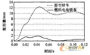 从车后门锁扣一点到B柱中部的距离S也常作为后排乘员空间变形量的一个评价指标。考察两车变形量S,可见燃料电池轿车基本未发生变形,好于原型轿车,如图11所示。