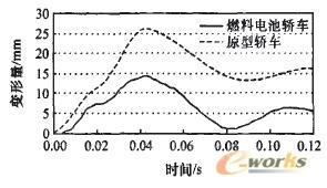 测量后排座椅R点(设计参考点)在地板上的投影点相对于地板不变形区域上的一点的距离,来衡量后排座椅的位移情况,如图12所示。从图12可知,燃料电池轿车后排座椅的位移情况同样要好于原型轿车。