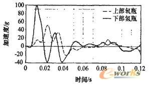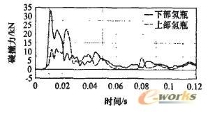 对于氢瓶在后面碰撞中受冲击的情况,可以通过氢瓶合成加速度曲线以及接触力的输出来考察,如图13和图14所示。