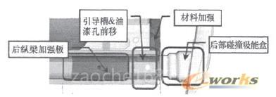 从图19可知,原结构后纵梁碰撞时,在氢瓶区域对应的纵梁中段发生较大的弯曲。参考传统汽车的后面碰撞油箱保护的设计理念,尾部理想的变形模式应保证后纵梁前端及尾端尽量产生较大的变形以吸收碰撞能量,而对氢瓶所在区域纵梁结构要保证足够的刚度,不希望产生较大的弯曲变形,以尽量避免与周围部件的二次撞击。为此,在后纵梁尾端设计一组后部碰撞吸能盒,再将尾段添加丽组压溃引导槽,并将原始的后纵梁油漆孔的位置后移,弱化该区域以诱导尾端的压溃,并在原后纵梁中部加入一加强板提高该段的刚度,同时将原后横梁材料强度提高,如图20所示。图21为改进后的氢瓶接触力曲线。