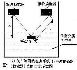 倒车捡测障碍糸统超声换能器的工作方式为反射式,,即发送传感器换能器发射40KHz频率的超声波,迂到障碍后反射被接收传感器的换能器接收并转换成电信号,见图2所示. 其传播介质为空气.