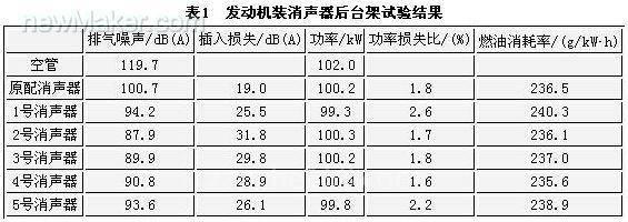 (3)配装新型2号消声器的发动机功率损失及燃油消耗与原配消声器变化不大,说明新型2号消声器在增大消声量的同时,并没有影响发动机的动力性能和经济性能,这说明新型2号消声器的设计是可行的。为降低LT1101汽车的整车噪声,可考虑将新型2号消声器作为原配消声器的替代产品。