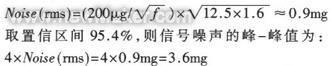 如果ADXl202的敏感轴从水平位置变化了5°,就相当于ADXL202输出的数字信号改变约87mg,这样14.4mg的噪声水平就显得过高了。因为期望的噪声水平最多不能超过信号的十分之一,即8.7mg。将XOUT、YOUT端口输出的200Hz数字信号进行16次采样,并将采得的信号取平均值,就可以实现数字低通滤波,将信号的带宽降为12.5Hz。此时的噪声水平为: