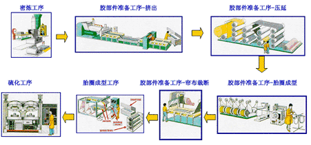 轮胎生产包括:密炼、挤出、压延、胎圈成型、帘布裁断、硫化等多个复杂的工序。