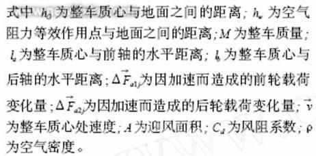 当车辆加速或减速时,依据力矩平衡原理,各轮的载荷会有变化。根据上述假设,在与整车质心处速度平行的方向上,可列出下面表达式( i = 1代表前轮,i = 2代表后轮,j = 1代表左轮,j = 2代表右轮)