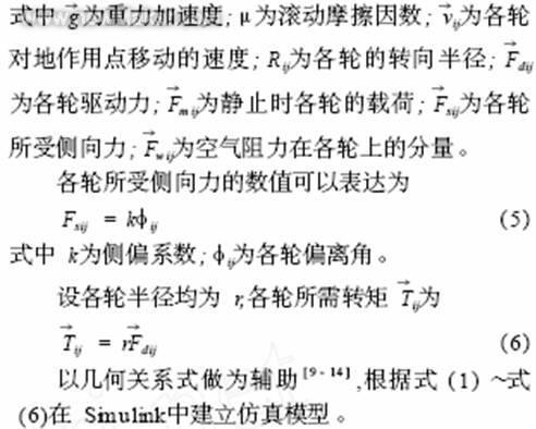 目前该领域已有一些积极的研究。Yoichi Ho2ri等设计并制造了由四电动轮独立驱动的电动汽车“UOT ElectricMarch II”,并在此车上试验了防抱制动系统(ABS)和牵引控制系统( TCS)的应用。文献将滑模变结构的优化器应用到电动轮驱动电动汽车的ABS和TCS的最佳滑移率寻优控制中,设计了基于固定滑移率控制的ABS和TCS。文献设计并试验了四电动轮独立驱动的电动汽车的电子差速系统。然而,对于变速或转向情况下四电动轮独立驱动时各轮转矩需求变化的研究尚不多见。作者以建模仿真这一简便有效的方法考察采用四电动轮独立驱动方式的电动汽车在变速或转向时各轮所需输出转矩变化的详细情况。