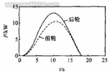 仿真试验共分3项。首先,设定车辆在15 s内从静止开始沿直线加速到20m / s (72km /h) ,然后减速,试验中整车速率、单侧前后轮功率和转矩曲线如图1~图3所示。