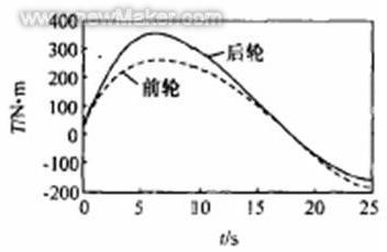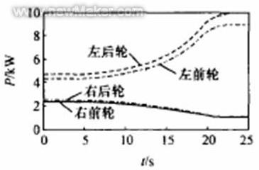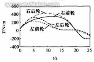 从图7~图9中可以看到:开始加速并转向时四轮功率和转矩的差异都不大。从第5 s起当转向半径开始变小且继续加速时,右侧两轮转矩继续增加,而左侧两轮的转矩却已经达到其最大值,随后开始下降。右侧两轮的转矩虽然约10 s时才先后增加到各自的最大值,但在从第5 s到第20 s的时间内一直都显著地大于左侧轮。在20 s之后,随着车辆进一步减速和转向半径稳定于20m,四轮的转矩均变为负值,且右侧轮的转矩变化趋势比左侧轮更显著。