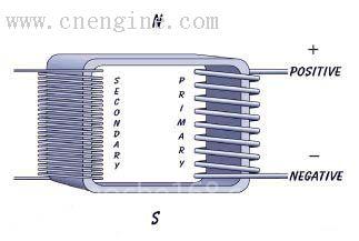 点燃混合气需要高能量的电火花,为此人们采用了多种不同的点火系统。升压变压器是当今较常用的一种点火系统。这种变压器采用低电压、大电流的电极来产生高电压、小电流的电极。它是由两个不同的线圈组成的。第一个线圈叫初级线圈,第二个线圈叫次级线圈(见图1)。为了增加磁场,初级线圈绕在一个铁芯上。在新式的变压器上这个铁芯是由许多片叠加在一起的黑色金属(通常为软铁)片组成的。相对于整块的铁芯,它的磁增强能力更好。