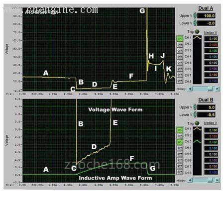 线圈充电饱和后,流经初级线圈的电流将受到限制(图2中E部分),但是磁场强度仍处在最大状态。注意,此时电流受到限制,但电压仍然低于开路电压(图2中F部分)。为了限制电流,线路中加了一个电阻,其作用是限制流经初级线圈的电流。如果初级电路中存在额外的电阻,电流限制的时间就会提前。如果线圈短路或阻值低于规定值,电流限制的时间就会滞后。所以,你如果知道电路设计的特点,从电流限制时间的变化就可以