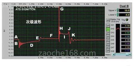 每当线路中有电感现象时,电流的变化就会产生一个反向电动势,这个反向电动势会阻碍电流的流动。每当线路中有电阻时,就会产生电压降,电压降的大小与电阻值成正比。从初级波形略为上升的底线(图4中的D部分)就可以看出这个电压降。如果将示波器的电压量程降低,放大初级点火波形的底部,就可以清楚地看见这个压降(图5中上半部的D部分)。