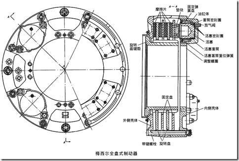 全盘式制动器摩擦副的固定元件和旋转元件都是圆盘形的,分别称为固定盘和旋转盘,其工作原理与摩擦离合器相似。