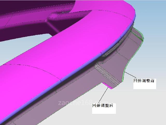 下图是一个利用该功能做回弹补偿的实例,图一零件绿色部分的形状延棱线形状向内做3°的回弹补偿角。有CAD造型常识的工程师可以很容易看出,通常的CAD软件用一次操作命令是不可能完成的,弄不好要花费一两天的时间。而应用“棱线扭转(S)” 功能,一条命令可以搞定。