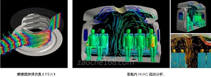 运用AcuSolve,列车外形得到了优化,减小了进隧道噪声。为提高客舱内部流动情况,工程师使用AcuSolve仿真,设计出更合理的空调进出口,从而优化夏天和冬天的乘客舒适性。其中涉及到的物理现象有强迫对流、自然对流、热辐射、湍流、热传递、热源和太阳辐射等众多物理模型。另外AcuSolve可以实现搅拌摩擦焊仿真,通过设计合理的焊接参数,提高车厢焊接工艺。