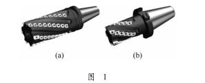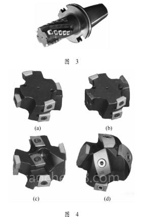 图1a 所示铣刀的圆周端齿刀片均为两个切削刃,可转位两次,侧齿刀片为四个切削刃,可转位四次;图 1b 所示铣刀的圆周端齿刀片为一个切削刃,不可转位,侧齿刀片为两个切削刃,可转位两次,相对来讲,前者的经济性更好一些。但一般后者较前者有效切削刃增加 1 倍多,因此进给量可增加 2 ~ 2. 5倍,在机床功率满足的条件下,具有更高的切削效率。