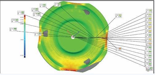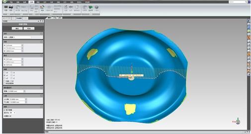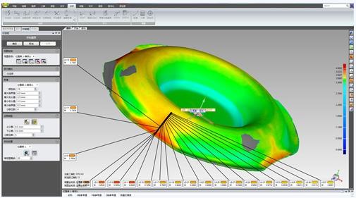 在软件中选择【厚度】分析选项,再选择【加载位置集】,此时可以导入刚才创建的每隔1mm间隔的分析点来,根据不同的公差要求,设置好相应测色差图谱的公差带后,软件可以自动加载相应点的厚度,并在数据图上标注出相应点的位置来。如果有多个截面需要分析,可以再一一加载即可。