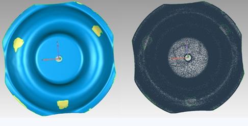 要对轮辐零件的厚度做出准确的评估,我们必须先获取完整的轮辐点云数据。考虑到轮辐类零件的加工尺寸以及精度要求,我们可以选择ROMER RA7525SI系列测量机来进行点云数据的获取。如果有合适的装卡工具,我们可以将产品竖起固定轮辐两侧,从而一次完成全部数据的扫描;如果不方便装卡,我们可以在轮辐表面使用热熔硅胶固定三个钢珠,钢珠需要固定在零件翻转两面进行数据扫描时均能扫到的位置,这样通过两次扫描获取零件正反两侧的完整数据。