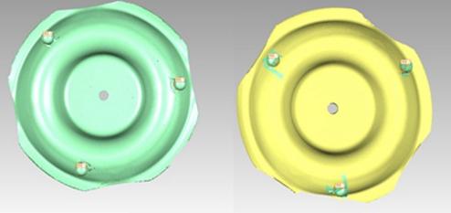 在Geomagic Qualify软件中,先将扫描的两片点云数据上的钢珠作为球体定义好,将其中一片数据定义为参考基准,另一片数据定义为测试数据,使用基于特征基准对齐的方式,将球体一一对应好,将数据拼接完成,并合为一个整体数据,同时将不再需要的钢珠部分的数据删除。