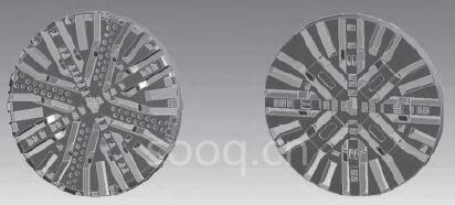 在整个施工过程中达到了最大日掘进13 环、拼装12 环及最大单月掘进476m 的超大直径盾构机的掘进记录。通过不同刀具的组合首次实现了在石英含量高的砂卵石、粘土地质条件下连续掘进2580m 没有更换刀具,图36 为完成掘进后的刀盘刀具情况。