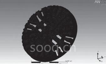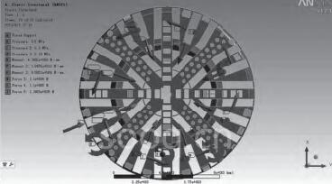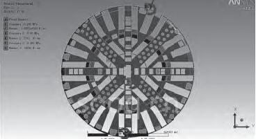 采用默认的网格划分方式,设定刀盘部分单元尺寸为30mm,共划分单元数3153537,节点数5546360。网格划分模型如图11 所示。