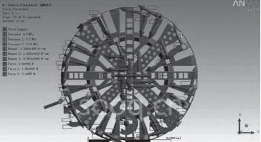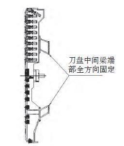 (1) 工况1、工况2 约束条件:在刀盘中间梁端部全方向固定( 图15)。