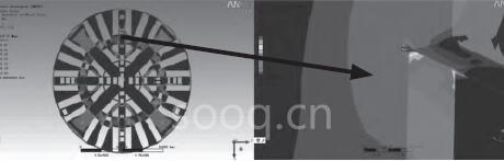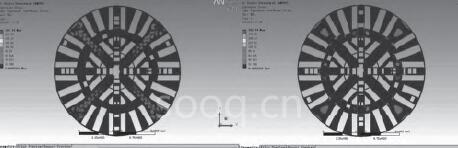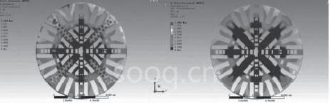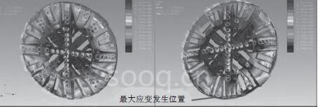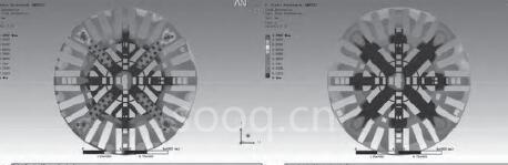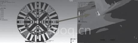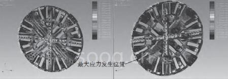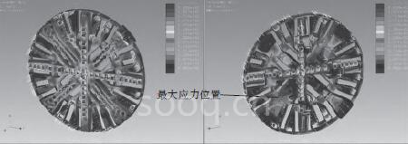 到压力与扭矩作用,而在边缘处,刀盘则是弯扭组合变形,由于刀盘材料的抗弯抗压强度不同,导致刀盘的变形差异。
