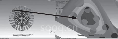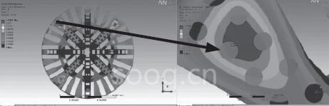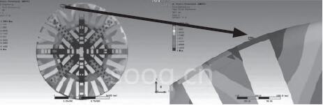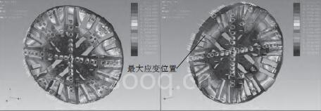 (b)刀盘的变形大小是由刀盘中心部位向边缘渐变的,越靠近边缘部位刀盘的变形越大,边缘处则出现最大变形。这是由于在中心部位有牛腿的支撑作用存在,刀盘受
