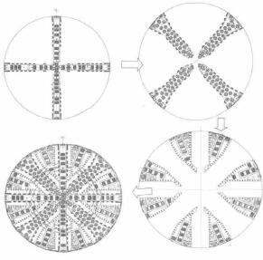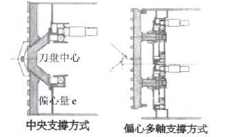 刀盘支撑方式有图2 所示的5 种支撑方式,本设计方案选用中间支承方式,中间支承方式是指通过中间梁来支承刀盘外周侧及内周侧的中间部分的结构,这样可以提高相对于作用在刀盘的偏心负载所产生的力矩的稳定性。同时,由于使用了大口径轴承,旋转平稳,这样土砂密封的可靠性也将提高。另外,由于旋转的刀盘和静止的中心隔板为相对运动,因此卷入土舱内的土砂也不易因粘附而使泥块增大。