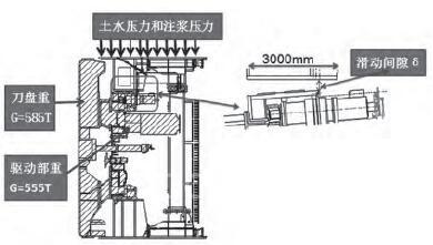 对于超大型盾构机,刀盘通过牛腿与主驱动连接,形成一个悬臂结构,由于刀盘和主驱动的总重量高达1100 吨,并且前盾在高埋深的土水压力及同步注浆压力的联合作用下,形成一定的变形量作用在主驱动上,如图3 所示,刀盘将会产生磕头现象,刀盘在旋转时将会做椭圆运动,从而导致中心回转接头的破坏,刀盘上的所有液压设备将不能使用。为解决该难题,对前盾上刀盘驱动安装基座进行优化设计,考虑设计一定的预变形量,并通过在主驱动滑动轴承内测添加超薄垫片来调整间隙如图4 所示,以抵消变形量,确保刀盘在工作时能与盾构中轴线保持垂直。