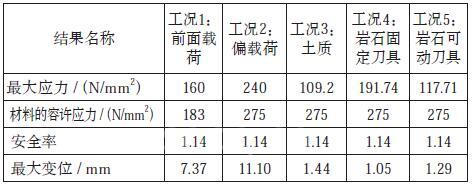 载荷条件考虑前面载荷工况、偏载荷工况、土质工况、岩石条件固定刀具载荷工况、岩石条件可伸缩刀具载荷工况这5 种工况。