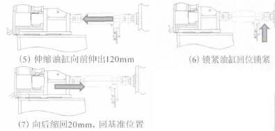 刀盘伸缩是通过在主驱动部后端设计24 组伸缩油缸和锁紧油缸来实现伸缩功能的,当需使用刀盘伸缩装置时,通过伸缩油缸把刀盘主驱动连同刀盘一起伸出或缩回,刀盘伸缩机构的工作流程如5 所示,首先通过伸缩油缸把刀盘连同驱动部一起向前开挖推进20mm,对章子面通过泥水或者气压维持掌子面的稳定后,把刀盘向后缩回120mm,锁紧油缸锁紧放置刀盘松动,待作业完成后,解除锁紧装置,将主驱动连同刀盘一起向前推进120mm,锁紧油缸回位锁紧后,通过伸缩油缸把驱动部连同刀盘一起向后拉回20mm 复位。