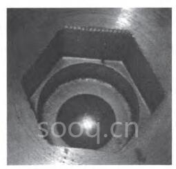 复杂型腔电火花加工分两步进行:首先用集束电极模拟出近似于实体电极形状的曲面如图5所示,再使用C350组电规准进行大部分材料去除的粗加工;第二步用表面经过打磨处理后的实体成型电极如图6所示对型腔进行精加工,实体电极配合电火花机床摇动功能,去除集束电极产生的管形加工痕迹,图7为实体成型电极加工后的型腔。