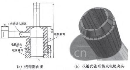 电极套筒是连接电极夹头及收紧螺母的零件。电极套筒与冲油管管道相连形成冲液加工用的型腔,上端的夹具接口与电极套筒形成螺纹连接,整体形成密封腔。电极夹头是用于完成对单元电极组合体可靠集束的零件。夹头的夹紧端外侧面具有锥面几何特征,沿其两端周向开有均匀分布的轴向收紧槽,呈花瓣式结构。其内侧面轮廓为所选单元电极的组合体的稳定集束几何轮廓。在受到电极套筒及收紧螺母提供的收紧力时,可以实现径向均匀收缩,从而完成对内侧单元电极组合体的可靠夹紧。