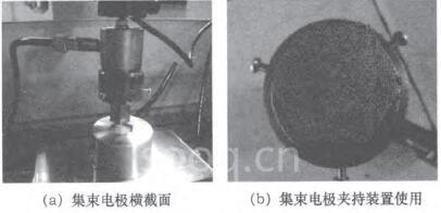 图3所示为集束电极横截面、夹持装置与机床主轴的连接以及工作液供液系统连接的实施例,根据机床供液方式设计电极夹具接口为侧面进液。