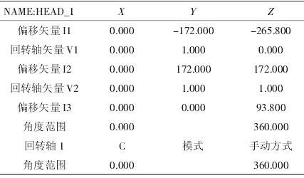 需要进行设置的参数有:1)回转轴矢量V1:回转轴B围绕Y轴旋转。2)回转轴矢量V2:回转轴C围绕Y轴和轴旋转。3)偏移矢量I1:在固定安装回转头I1=-(I2+I3)时矢量结束。4)偏移矢量I2:回转轴1的回转中心到回转轴2的回转中心的距离。5)偏移矢量I3:刀具基准点到回转轴2的回转中心的距离。6)万能回转头为手动旋转模式,B轴与C轴的回转角度范围为0°~360°。具体设置如表1所示。