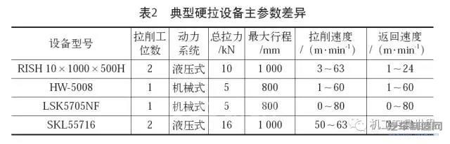 目前,国内市场上硬拉设备普遍为工作台提升式立式拉床,拉刀由上部穿过工件并由底座上的拉削夹头夹紧,装载工件的工作台由液压系统驱动由下而上延刀具轴线提升进行拉削。工作台提升式拉床的主要优点在于该设计可避免使用传统的地坑或操作平台,机床在地面上放置便可进行加工且便于搬运和维修,此外该类机床的结构大大简化了配备各种自动化装置的工程,可方便客户要求组成各种自动线,目前国内市场上使用的典型硬拉设备具体如下,各设备主要参数差异如表2所示。